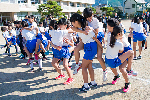 続いて2人1組でひとりが相手の背中におんぶされ、おんぶしている人から落ちないように上半身をぐるりと一周するゲーム。全身の筋力とバランス能力が問われる難易度の高いゲームで、一発でできた子、途中で落ちた子、落ちないよう必死にふんばる子などさまざまでした。最後に代表3組のコンビがみんなの前に出て、どのコンビが一番早くできるか勝負!「がんばれー!」「落ちるー!」と児童たちから大きな声援が飛び交いました。