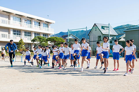 前日の厳しい冷え込みから一転、当日は朝から気持ちいい快晴が広がりました。授業に参加する5年生、6年生の児童たちは、授業が始まる前からグラウンドに集まり、みんなで走り回ったりバスケットボールを楽しんだりと元気いっぱい。「世界大会で2つのメダルを獲り、オリンピックにも3大会出場されているすごい先生が、みなさんのために夜須小へ来てくださいました。貴重な機会ですが、ふだんどおり集中していきましょう!」と平石誠校長の挨拶の後、いよいよ授業がスタートしました。