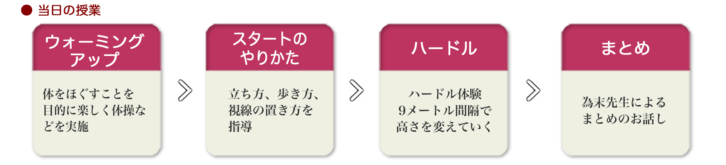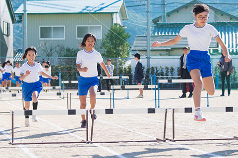 児童が自分で目標(ハードルの高さ)を決め、それをクリアする達成感を味わうハードルの授業。「ハードルは川で葉っぱが岩をスルッとすり抜けていくようなイメージで跳ぶんですよね。みんなも最初と最後をくらべるとハードルの跳び方がものすごく上手になったと思います」と為末先生がコメントして、1時間目の授業は終了となりました。
