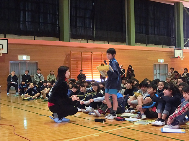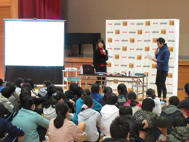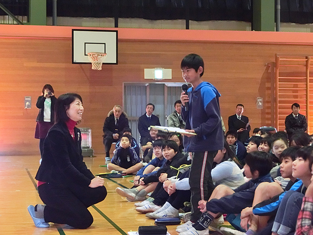 2時間目は児童と保護者を対象にした食育の時間です。1時間目に体を動かした後で食事について考えることで、「体を上手に動かすのは食べ物。そして食べ物は夢を実現する力になる」ことを感じてもらうのがねらいです。多くのトップアスリートを栄養面で支えるスポーツ栄養士のこばたてるみさんを講師に迎え、為末先生と共に現役アスリートの食生活や、子どもの能力を高める食事について語っていただきました。また後半は児童が考えてきた「運動会のお弁当」について講評をいただきました。