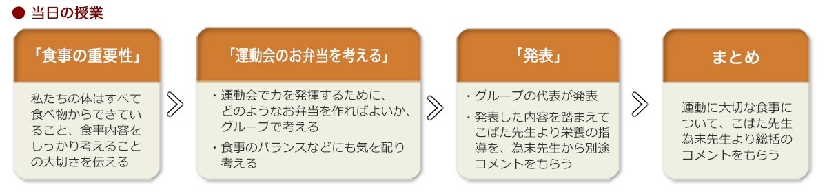 いよいよお弁当の発表タイムです。6年生にはあらかじめ班に分かれ、料理カードを組み合わせることで「運動会で食べるお弁当」を考えてもらいました。授業ではその中から為末先生が注目するお弁当をセレクト。選ばれた班の児童たちに、お弁当メニューの内容やこだわりについて発表してもらいました。