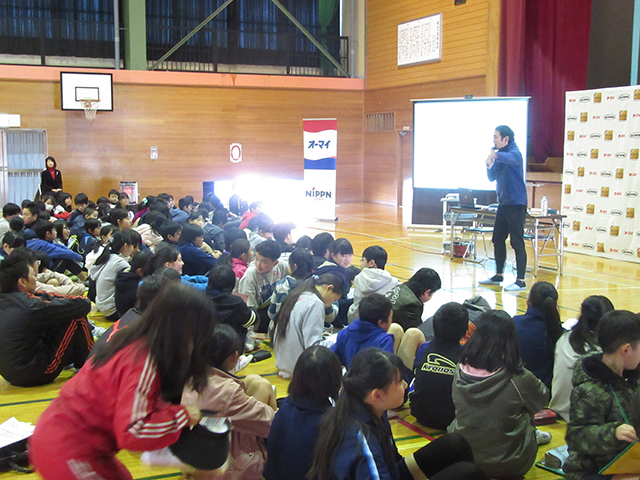 最後にみんなに<夢がかなうコツ>についてお話したいと思います。1つめは、とにかくやってみるということ。やってみて、違っていたらやめたらいいんです。大事なのは、トライすること。2つめは、友だちの夢を応援するということ。今日はいろんな友だちの夢を聞いたと思うので、これから友だちの夢を応援してあげてください。3つめは、思いを大事にするということ。大人が夢は何ですか?と聞く時、職業を聞くことが多いんです。でも本当は、職業は手段であって、その職業になった時にどんなことがしたいのか、というのが夢なんですね。たとえば野球でファンを喜ばせたいというのが夢で、そのためにプロ野球選手になるんだということ。今はよくわからないかもしれないけど、自分はどんなことをしたいのかという夢のむこうにある思いを考えていってくれたらいいなと思います」 と児童たちにエールを贈り、爲末大学食育学部の授業はすべて終了となりました。