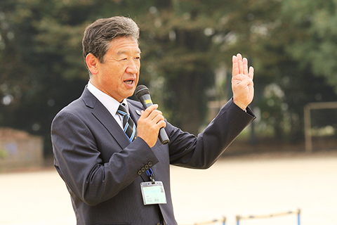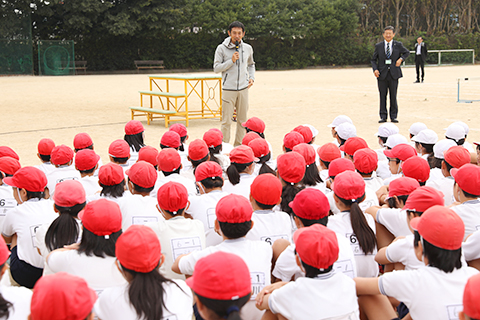「今日はすごい人が来てくれました!みんなもテレビで見たことがあるんじゃないかと思いますが、今日はみんなでいろんな勉強をしましょう」という川上哲也校長のお話のあと、「今日はみんなでハードルの授業をやりましょう」と為末先生が挨拶。「よろしくお願いします!」と児童たちが元気に挨拶して、1時間目の授業が始まりました。