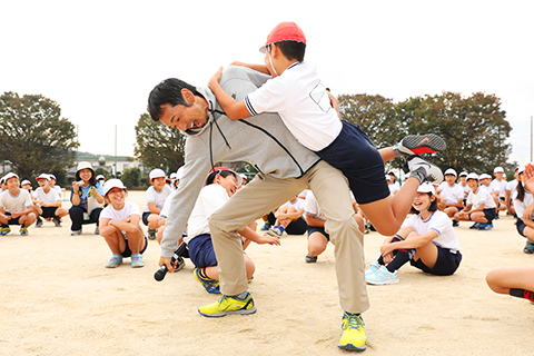 2人1組で向かい合い、ひとりはドラえもん、もうひとりはドラミちゃんになります。為末先生がドラえもんかドラミちゃん、どちらかの名前を呼んだら呼ばれたひとが相手の手を握り、呼ばれなかったほうは相手の手から逃げる、という爲末大学食育学部定番のゲームです。「さあいくよ。セット。…ドラミちゃん!」「セット。…ドラえもん!」と為末先生が呼ぶたびに、児童たちからは「うわー!」と歓声が上がりました。次は偶数・奇数バージョンにチャレンジ。「セット…7!」「2+2!」「8-5!」「3×4!」と計算がむずかしくなっていくたびに、「いえーい!」と勝ち誇る子や「あー!」と崩れ落ちる子も出てきて、みんな楽しそうです。