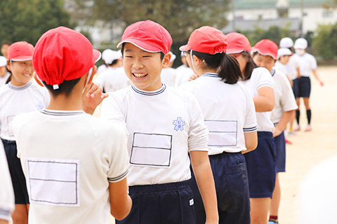 当日の天気は曇り。前日の雨でグラウンドの土がほどよく落ち着き、ハードルを跳ぶには絶好のコンディションとなりました。1時間目のハードルの授業にチャレンジするのは、162名の6年生。授業前から元気な児童たち、カメラを向けられるとみんな集まってきて笑顔でピースサインを見せてくれました。