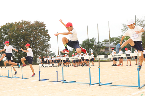 1時間目の体育の時間は、走り方やハードルの跳び方を学びながら、児童たち一人ひとりが跳びたい高さのハードルを選んで自由に跳ぶという授業です。自分で目標を設定し、それを達成していくことでチャレンジする大切さ、運動の楽しさを実感してもらおうというのがねらいです。