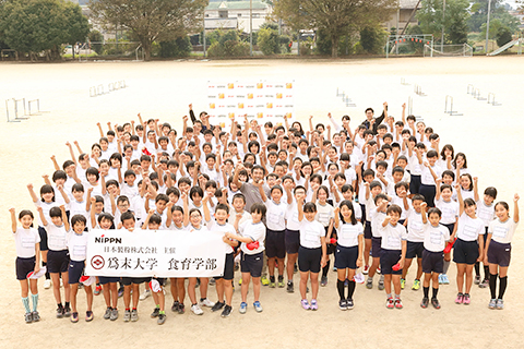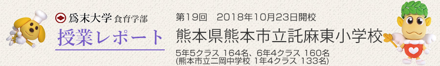 通常は1学年を対象に行われる爲末大学食育学部ですが、今回は5年生、6年生それぞれ160名を超える2学年が参加。さらに3時間目には隣接する二岡中学校の1年生も加わり、総勢459名というこれまでで最大の児童・生徒数となりました。
