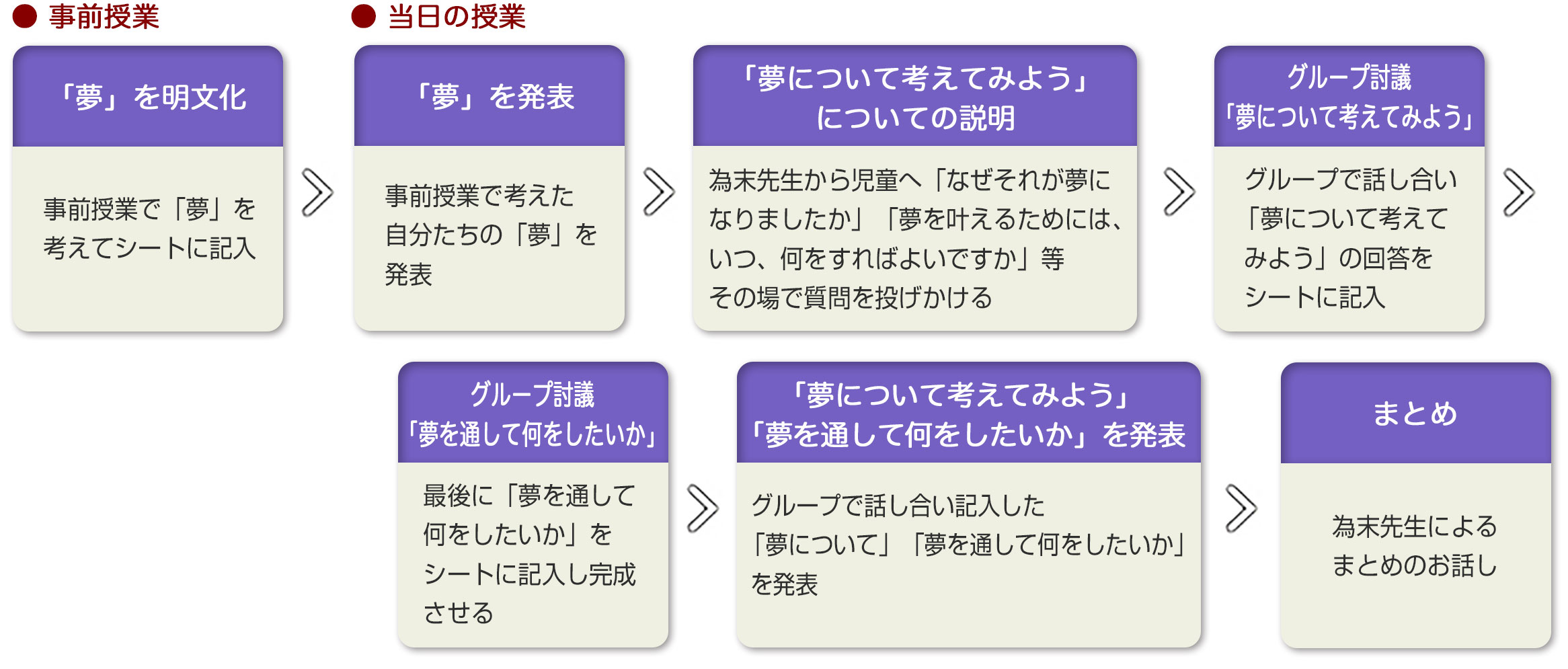 「1つめは、今日はまわりがどう思うのかなということは気にしないで、自分がどう思っているかということを考えてください。2つめは、みんなと違う夢を発想してみてください。3つめは、友だちにどんどん質問したり、こうしたらどうか?と広げてみてください」