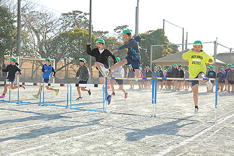 何周か跳んだところで、「犬がおしっこをするみたいに片足を真横に90度に上げてみて。すると勝手に身体が前にたおれるからね」と為末先生。児童たちの走って跳ぶスピードが一気に上がり、何回か跳ぶうち、最初より高いハードルにチャレンジする子も登場しました。