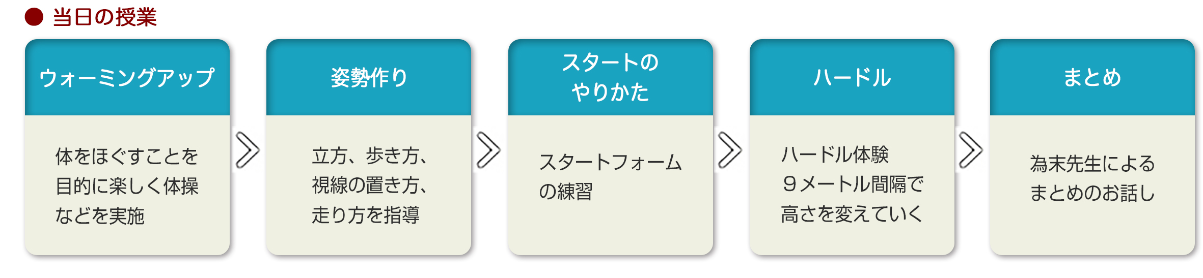 1時間目の体育の時間は、為末先生から走り方やハードルの跳び方を学ぶ授業です。そして授業の初めより少しでも上達することで、チャレンジすることの楽しさを知ってもらおうというのがねらいです。