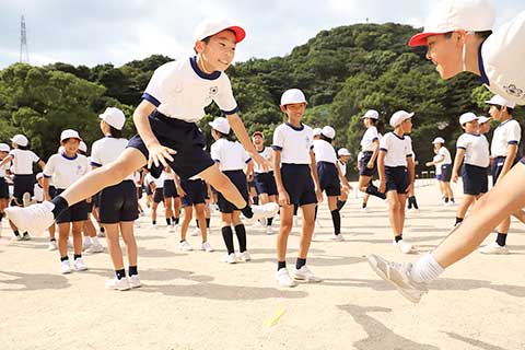 周南市の南東に位置する櫛浜小学校は、まもなく創立150年の節目を迎える伝統校。緑あふれる森が校舎を包みこみ、少し歩けば海へ出る、そんな恵まれた自然環境の中で学校生活を送る5年生62名、6年生51名がハードルの授業に参加しました。アスリートによる直接指導は貴重な体験ということもあり、多くの保護者が見守る中、体操着姿の児童たちが元気に校庭へ集まりました。