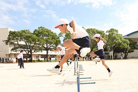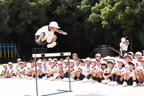 ザワつきながらも、先生を真似てジャンプするようにスキップする児童たち。最後は手を大きく振りながら速くスキップする練習をして、いよいよハードルの練習に取り組みます。