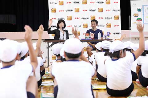 まずは、こばた先生が為末先生に「今朝は何を食べられましたか?」とたずねると「ホテルのカレーがおいしそうだったので食べました」と為末先生。では児童たちはどうでしょうか? 朝ごはんは何を食べたか聞いてみると、「主食を食べた」という人は大半でしたが、「主菜を食べた」「野菜を食べた」「乳製品を食べた」「果物を食べた」と質問を重ねるほど挙がる手が少なくなりました。パンやごはんなどで朝食をすませる児童が多いようです。