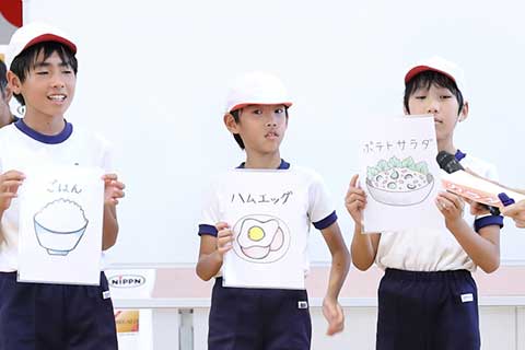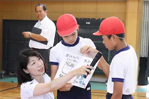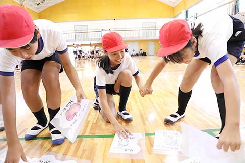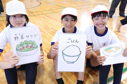 ゲームでは、いろいろな料理が描かれたイラストカードが1人1枚わたされました。児童は自分のカードが主食(エネルギー)、主菜(体づくり)、副菜(コンディショニング)のどれに当てはまるのかを考えて、主食、主菜、副菜の3種類がそろうように3人1組のチームを作ります。体育館の中をスキップした後、笛の合図でお互いのカードを見せ合う児童たち。代表としていくつかのチームに発表してもらい、料理の組み合わせがあっているかみんなで確認しました。