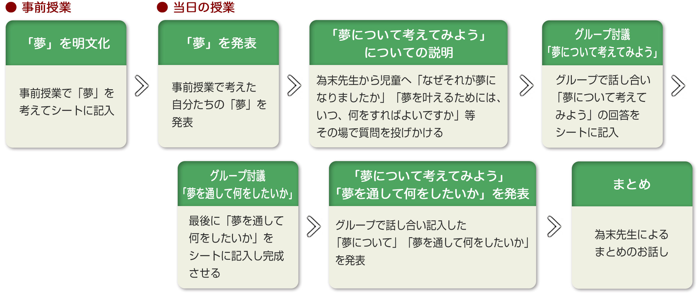「1つめは、こんなこと書いたら先生が喜ぶんじゃないか、友だちがどう思うのかなということは気にしないで、自分がどう思っているかということを考えてください。2つめは、みんなと違う夢を発想してみてください。大きな夢、変わった夢がいいね。3つめは、友だちの夢を聞いて、それは難しいんじゃない?なんて否定するのは禁止。だったらこうしたらどう?という風に一緒に夢を広げてみてください」
