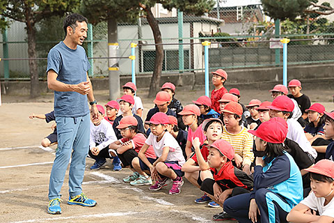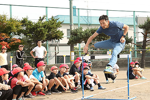 「今日は体育、食育、夢という3つについて取り組んでもらいます。しっかり内容を聞いて、たくさんのことを学んでいただきたいと思います」という渡辺聡校長による挨拶のあと、為末先生が「今日は一緒に勉強しましょう! じゃあ今からかけっことハードルの練習をします」というと、90人の6年生児童が「はい!」と元気に挨拶。さっそく1時間目の授業が始まりました。