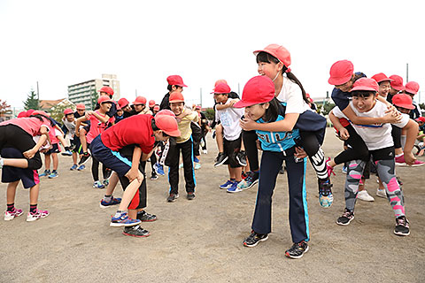 最後は、1人がおんぶをして、おんぶされた児童がおんぶしている児童の上半身をぐるっと一周して戻るゲームです。全身の筋力を使いながら、いかにバランスを保って落ちないようにするかがコツ。難易度の高いゲームだけに、おおいに盛り上がりました。