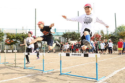 教えれば教えるほど、瞬く間にマスターしてしまう児童たち。為末先生も「犬がおしっこする形で、足を曲げて真横に上げると、体が自然に前に倒れて跳びやすくなるよ!」「ハードルの上にフスマ(うすい壁)があって、それを蹴破るように跳んでみて!」と次々に跳び方のヒントを教えていきます。児童たちもチャレンジをひとつずつクリアしていくのが楽しそう。「オレはまだ1回も倒してないよー!」と嬉しそうに話す児童もいました。