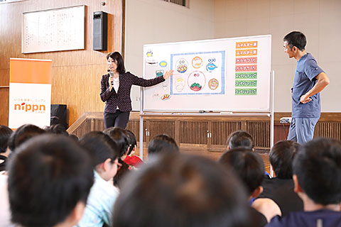 さらに、食べ物の役割についてもみんなで考えました。ごはんやパン、パスタなどの主食は「エネルギー源」、肉や魚などの主菜や乳製品は「カラダづくり」、野菜やきのこ類などの副菜、汁物、果物はカラダを整える「コンディショニング」の役割があることを紹介(果物は糖質もあるので、エネルギー源にもなります)。「いろんなものをバランスよく食べることで病気になりにくい丈夫なカラダになるんです」とこばた先生は役割の異なる食べ物をバランスよく食べる大切さについて、児童たちに解説しました。